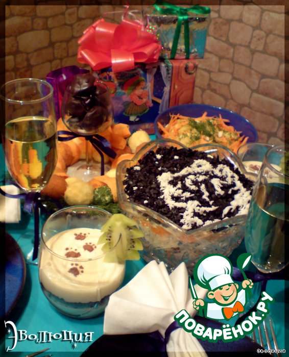 Как хозяин наступившего года, тигр часто окидывает свои владения внимательным взглядом и тогда на ночном небе возникает его звездный силуэт… Несколько лет назад меня этим салатиком угостила мама моей подруги. За это время я привнесла в рецепт два дополнения:) И пожалуйста, не пугайтесь в этом салате единения чернослива и консервированной рыбки! Чернослив ведет себя как джентльмен и не забивает вкуса рыбы, а лишь своей кислинкой изящно дополняет. На конкурс «Gorenje: новогодняя композиция».