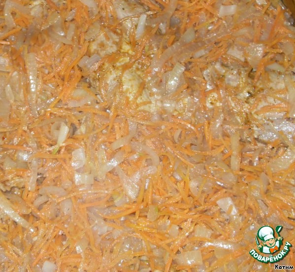 Затем поместить обжаренное мясо в форму для запекания, предварительно посолив и приправив по вкусу. Морковку натереть на терке (я терла на терке для корейской моркови), лук порезать полукольцами и все это обжарить в том же масле, где жарилось мясо. Залить овощи сливками, потомить немножко и добавить красное вино, потушить, помешивая, около 5 минут. Вылить полученный соус на мясо и поставить в духовку, разогретую до 200 градусов. Запекать в течении получаса.