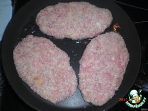 Вымешать тщательно фарш, яйцо, булку, посолить и поперчить, я не добавляю ни лука, ни чеснока, так получаются более нежными без лишних запахов. Сформировать большие шницели сантиметров по 10, обвалять в сухарях и жарить на среднем огне до готовности.