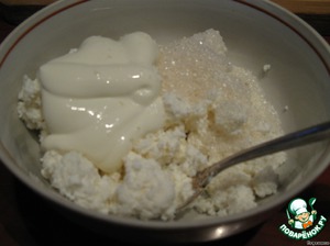 Теперь приготовим сладкий творожок: смешаем творог, сметану и сахар. Конечно, можно купить готовый сладкий детский творожок или творожную массу.