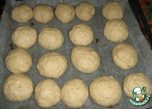 Оставить минимум на час, тесто увеличится в объеме раза в 3, обмять его и оставить ещё на полчаса. Жаль нет фотографий этого процесса. После второй обминки сформовать небольшие булочки (у меня вышло 18 штук). Выложить их на противень и дать подняться. Потом смазать ТЕПЛОЙ ВОДОЙ (!) и выпекать при 200гр около часа. -