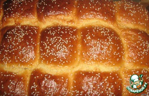 Яйцо хорошо взбить с сахарной пудрой и смазать булочки дважды.Посыпать кунжутом(если есть)и выпекать при 200гр минут 45 и затем убавив жар до 175-180гр печь до появления красивой темной корочки.Она обязательно будет темной из-за сахарной пудры. -