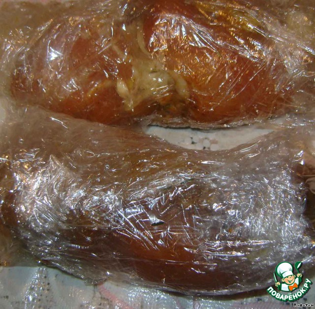 Заворачиваем наши рулетики в пищевую плёнку. Я её отмеряла прямо на рулетике, чтобы хватило завернуть. Вот они завёрнутые. У меня всего 2, так как было уже готовое, замаринованое мяско и я добавила 3 ножки.