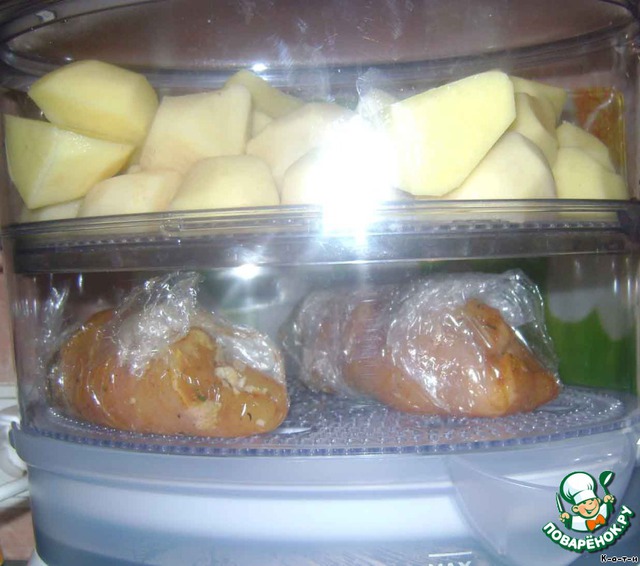 Включаем пароварку, кладем на нижний уровень наши рулетики на нижний уровень, а картошку на второй. Выставляем таймер на 30 минут и занимаемся своими делами. Я болтала с подружкой и готовила мяско на следующий раз :-) .