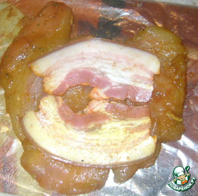 Кусочек раскладываем на доску, я ещё пакетик подложила, чтоб снимать удобнее было. На него раскладываем 2 кусочка бекона...