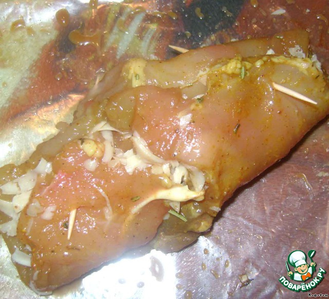 Затем заворачиваем мяско рулетиком и скрепляем 2 зубочистками. Это не сложно