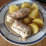 В этом шаге не фото. Мяско отделяем от косточек (это если у нас не филе), отбиваем и маринуем минут 15. В моём маринаде: соевый соус, карри, красное вино и припрва для курицы. Можно просто приправкой обмазать. Тем временем, чисти картошку и режем на 2-3 части. Да, у меня не получается аккуратно снять мяско с кости, так я эту грудку вдоль на две части разрезаю. Так и получается 4 рулетика из 2 грудок.