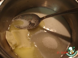 Пока печется, делаем шоколадную глазурь: смешать 3 ст. л. масла, 2 ст. л. молока, 5 ст. л. сахара, помешивая, довести до кипения (порция получается большая, у меня осталась глазурь)