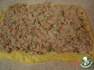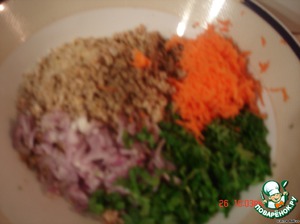 Пока печется, делаем начинку: свинину перемолоть, лук порезать, морковь трем, зелень мелко порезать. Добавить специи и соль. Позже я добавила 2 ложки сметаны