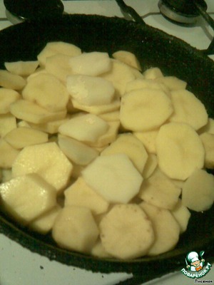 Картофель почистить и нарезать тонкими пластинами-кружочками и выложить на сковородку.