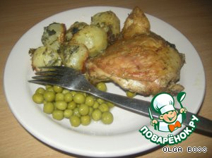 Выкладываем на серединку сковородки бедрышки, вокруг - картофель.