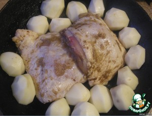 Выкладываем на серединку сковородки бедрышки, вокруг - картофель.