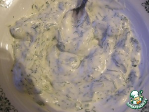 Готовим соус: меленько нарезаем петрушку и укроп, перемешиваем со сметаной, немного подсаливаем.