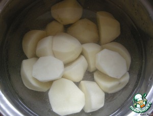 Картофель чистим, моем и режем на половинки, если крупный, то на четвертинки.