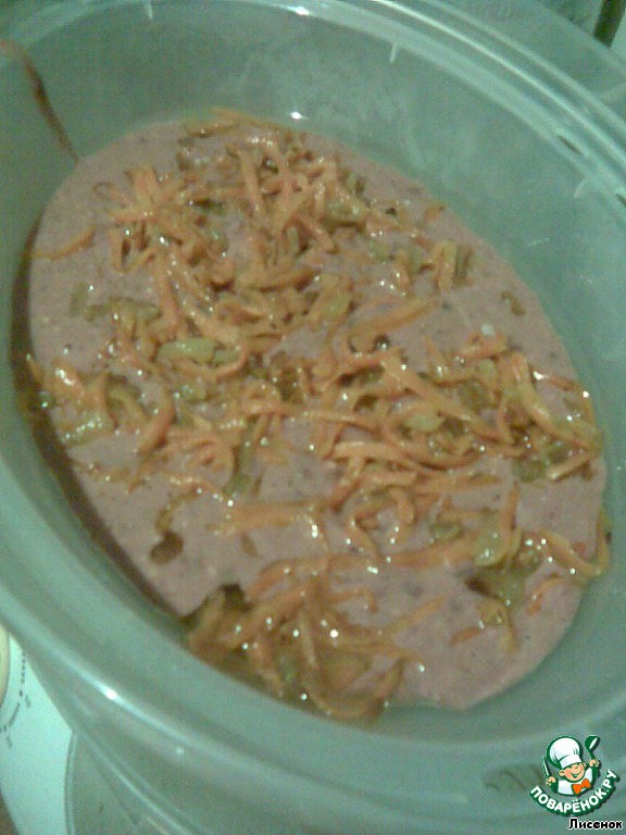 Сверху обжаренные лук и морковь. И так чередуем слои.