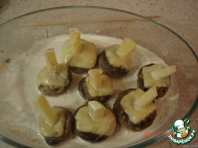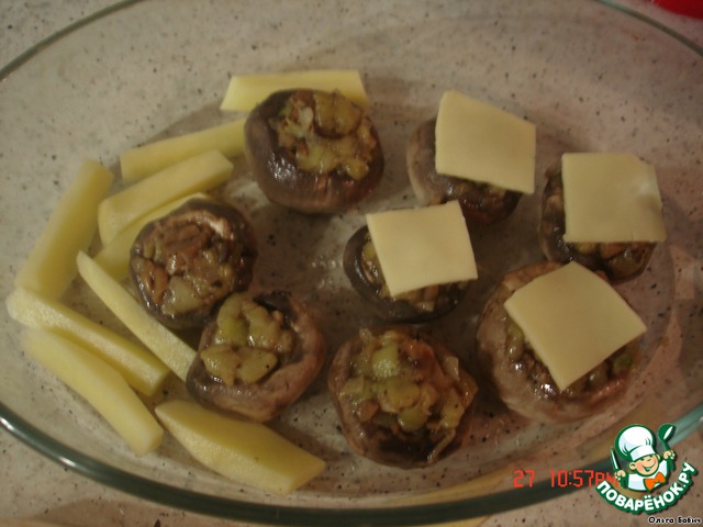 Масло слить, нафаршировать шляпки, прикрыть их кусочками сыра. Порезать картофель брусочками