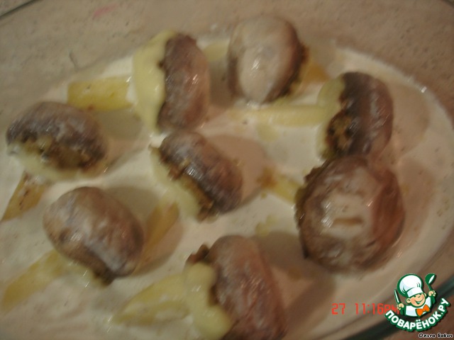 Уже никого не удивить чем и как можно нафаршировать грибы. Мне очень понравилась подача этого блюда, очень красиво смотрится на столе. Жаль не смогла выразить это на фото. Из книги "Фаршированные блюда"