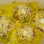 В середину макаронного гнезда положить начинку из сердечек, сверху засыпать сыром. Положить 1 яйцо или 2 желтка, добавить еще сыра, чтобы яйцо держалось, и сверху засыпать пармезаном -