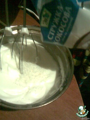 Для второй начинки взбить два белка и ввести постепенно кокосовую стружку.