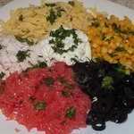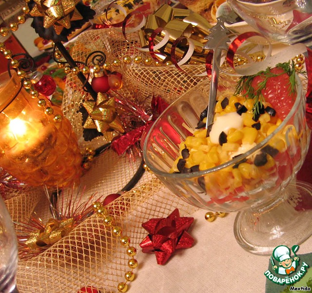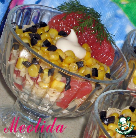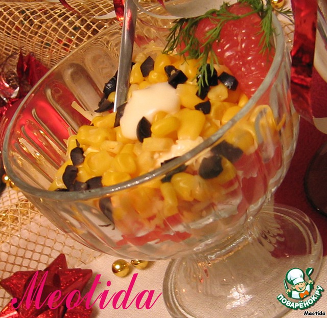 сверху посыпаем салат кукурузой и измельченными маслинками