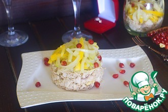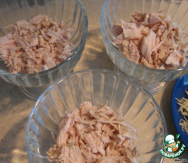 первый слой - измельченная ножом курочка, слегка смазывается майонезом