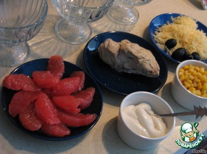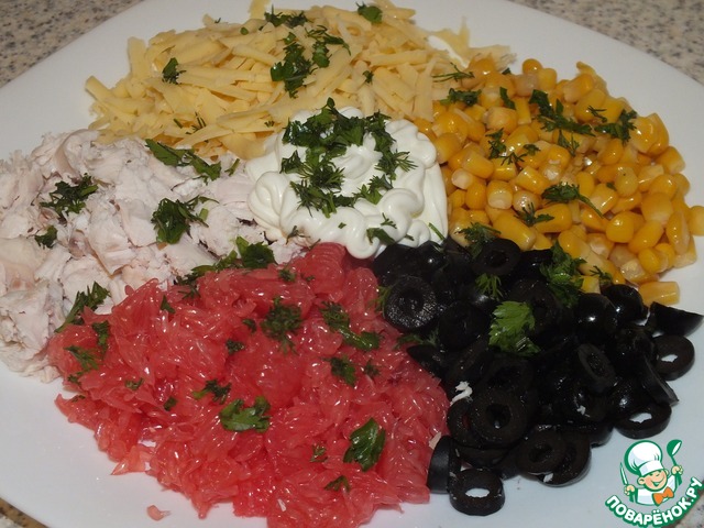 обожаю этот салат... НО оооочень редко получается его приготовить.. до стостояния салата:) ... когда я начинаю чистить грейпфрут, то сама того не замечаю, как съедаю его ВЕСЬ и до салата он не доживает... НО в этот раз мне достались три чудесных фрукта, два из которых постигла участь быть быстро уничтоженными... а ОДИН дожил до салата... в сочетании с вареной курочкой.. сыром... сладкой кукурузкой, легкими вкраплениями маслинок... это просто невероятно вкусно..
