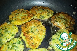 Разогреть сковороду, влить достаточное количество масла и столовой ложкой выкладывать оладьи. Обжаривать с двух сторон до появления корочки. Готовые оладьи переложить на бумажные полотенца, чтобы удалить излишек масла. Оладьи подавать на стол горячими, посыпав сыром.