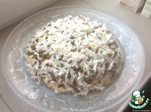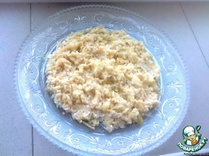 Итак, приступим. Варим картошечку и, когда остынет, трем на крупной терке, перемешиваем с небольшим количеством майонеза и выкладываем на блюдо. Пробуем на соль.