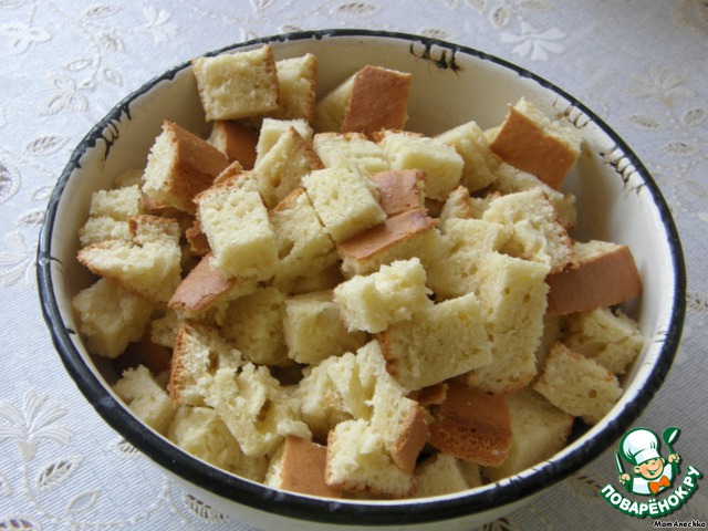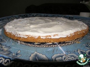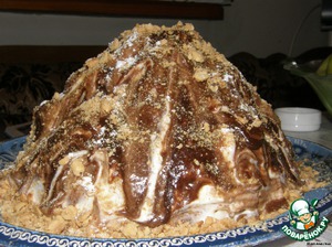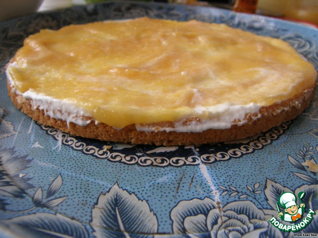 • Кубики обмакиваем в крем и выкладываем горкой на первый корж, иногда добавляя пюре или варенье.
