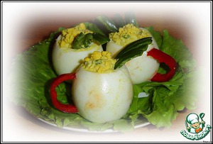 Яйца очищаем и отрезаем верхушки. Аккуратно вынимаем желтки, измельчаем их, сыр натираем на терке, горох пропускаем через мясорубку. Все перемешиваем и заправляем смесью майонеза и сметаны (50 на 50), солим, перчим по вкусу. Этой заправкой начиняем яйца. Из зеленого сладкого перца вырезаем "пену".