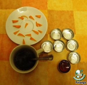 Желтое желе: выдавить из апельсина сок, подсластить, добавить желатин.