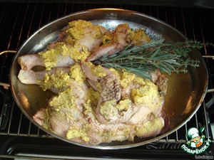 • Итак, курочку кладём на противень (можно сухой) и обильно посыпаем сухим тимьяном (перетрите в руках веточки, нам нужны только листочки).