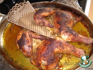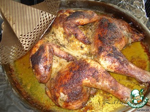 • Курочку, само собой, моем, промокаем полотенечком и разрезаем по спинке, делая её подобие "табака", чтоб она была "постройнее", вернее, получается более плоской, ладошкой надо подавить её, чтоб суставчики слегка поломать (кошмар! такое отношение к женщине! - но надо! надо, Федя!).