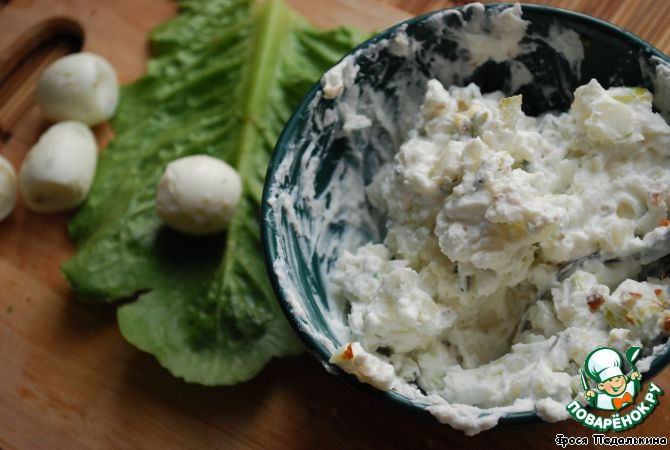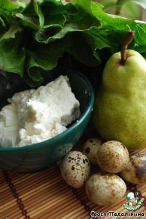 • Грушу нарезать маленькими кубиками, мяту мелко покрошить, смешать все с творогом. Яйца сварить вкрутую, очистить.