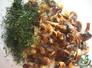 Лук и грибы обжарить на растительном масле. Выложить в салатник, остудить. Добавить зелень по вкусу. У меня был замороженный с лета укроп.