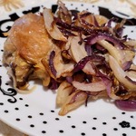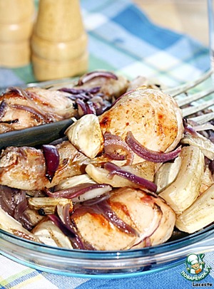 Куриная голень в маринаде из оливкового масла и бальзамического уксуса, запеченная с фенхелем и красным луком.