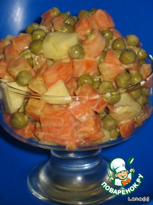 Добавить по вкусу зеленый горошек из банки. Заправить солью и майонезом.