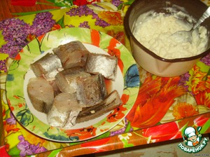 Размораживаем рыбу. Солим ее. Режем. И готовим сырный соус. Муку слегка поджарить с маслом, осторожно развести молоком, вскипятить. Сырок разрезать на кусочки, опустить в соус и мешать до полного растворения. Добавить соль, специи. (на фото соус успел остыть, загустеть, а так он получается однородный, кремообразный).