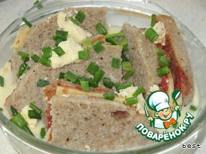Огнеупорную форму смазать сливочным маслом, выложить сендвичи и залить их молочной смесью. Выложить кусочки масла сверху на сендвичи. Посыпать зеленью.