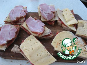 Хлебные ломти смазать хорошенько кетчупом. На каждый ломтик положить сыр и на половину ломтиков положить ветчину. Сформировать сэндвичи.