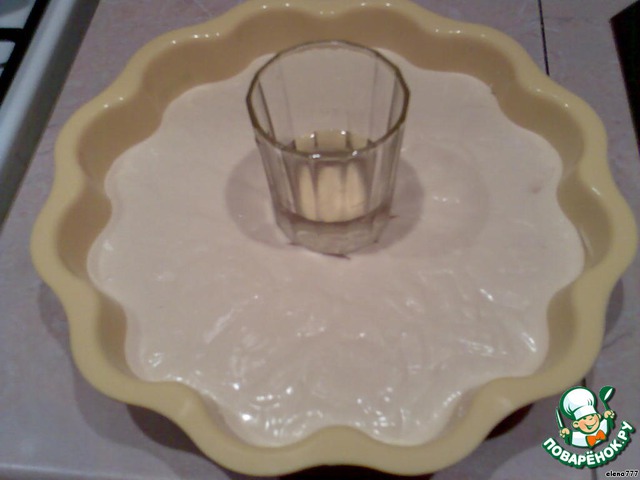 В силиконовую форму поставить стакан, наполовину наполненный водой (если эта форма без центральной выемки), вылить вокруг стакана глазурь, выложить на неё курагу.