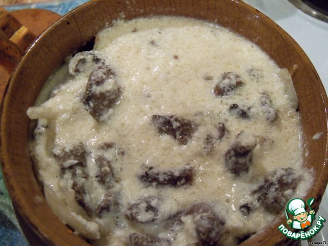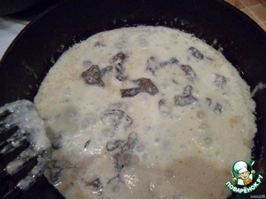 Приготовим соус: грибы слегка обжарить, залить сметаной (сметаны было мало добавила пару ложек майонеза)и дать прокипеть пару минут