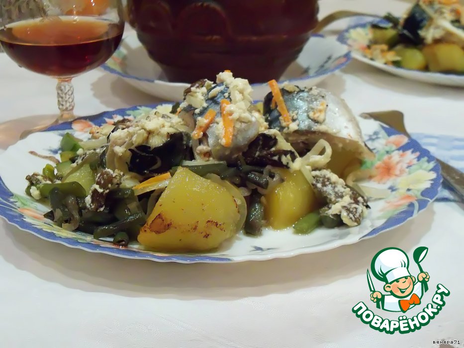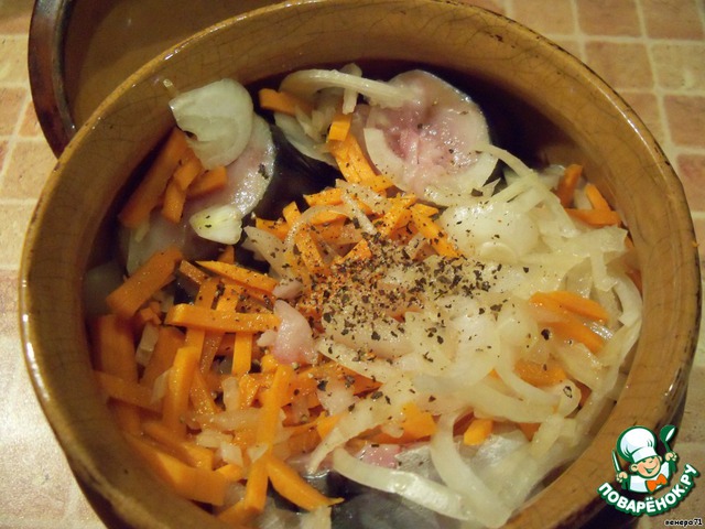 Берем горшочек (у меня один горшочек, но большой) на дно укладываем половину моркови с луком, дальше нашу рыбку (не забываем посолить, поперчить) и укрываем оставшейся морковкой с луком