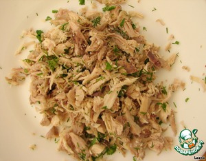 Отварное куриное мясо разбираем на волокна и перемешиваем с измельченной зеленью.