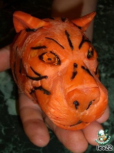 На ледяной скале выкладываем салат в форме тигра. Устанавливаем голову. Грудку, кончики лап и хвоста покрываем мелко натёртым яйцом, а всю остальную "шкуру" делаем из варёной морковки, натёртой на мелкой тёрке. Полоски - из нарезанных полосками маслин. Красавец тигр готов!