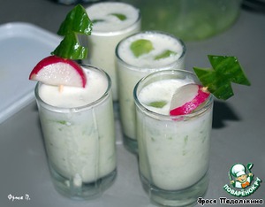 Подавать в небольших стаканчиках. Украсить редисом и огурцом.