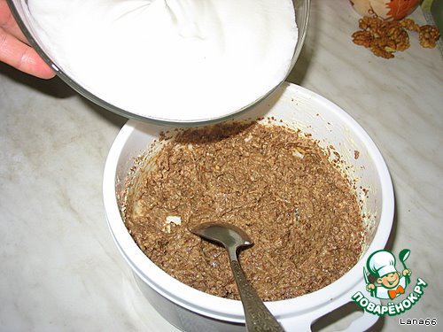 Затем добавить порционно белковую пену и осторожно перемешать.