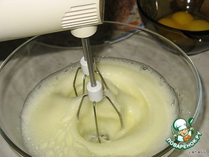 Яичные белки отделить от желтков и взбить с 50 гр сахара.