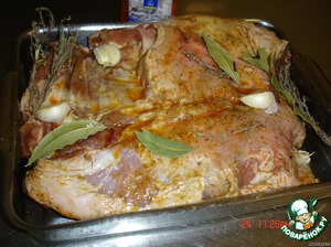 За сутки ребро смазать смесью растительного масла, чеснока, паприки и оставить в холодильнике мариноваться. На следующий день уложить в лоток для запекания, добавить ароматные травы, накрыть фольгой и поставить в духовку на 60 мин. при Т 200*