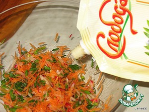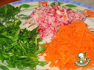 Подготовить овощи к салату. Для этого морковь и редис протереть через терку. Зеленый лук порезать наискосок.